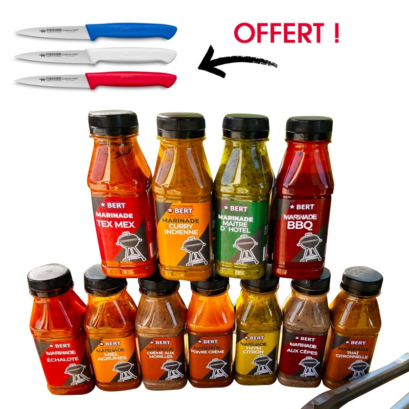 11 Marinade Complet prête a l'emploi + 3 couteaux office Fischer bleu/blanc/rouge OFFERT