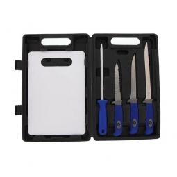 Composition : 1 couteau à éffiler lame 20 cm + 1 couteau à éffiler lame 15.5 cm + 1 couteau à écailler lame 13 cm + 1 aiguiseur mèche 19 cm + 1 planche à découper. Manches bleues pp + caoutchouc. Acier inoxydable 3CR14.